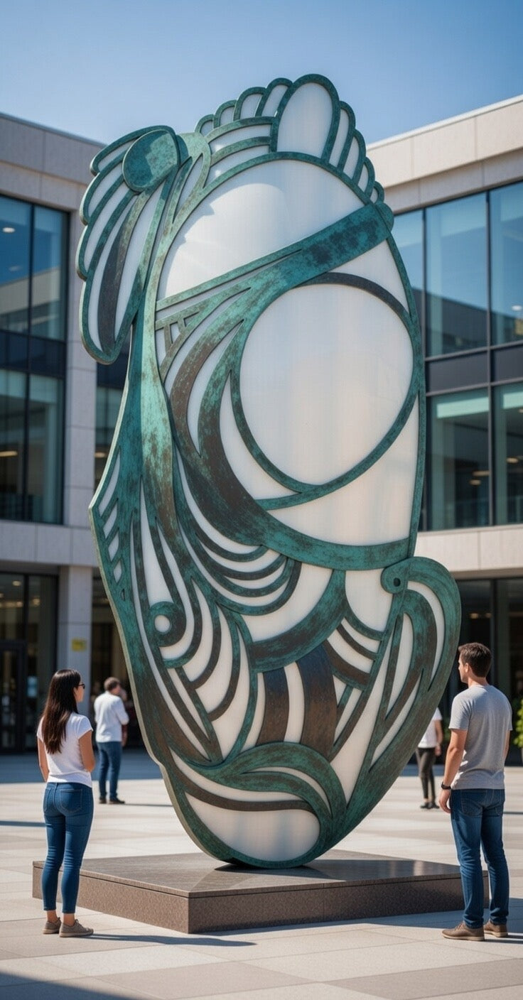 Elevate your public space, corporate campus, or private collection with Crescent Sole, a commanding 20-foot-tall masterpiece that blends mythological grace, modern abstraction, and dynamic presence. This towering hybrid form fuses an oversized, elegantly arched foot with sweeping wing-like extensions, evoking themes of ascent, grounded ambition, and ethereal flight. The intricate openwork design features swirling organic patterns and bold circular motifs that play with light, shadow, and negative space, creating a sense of movement even in stillness.